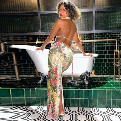 섹시한 허리 없는 스트랩 없는 상단 슬림 스플릿 스커트 V 목 긴 길이