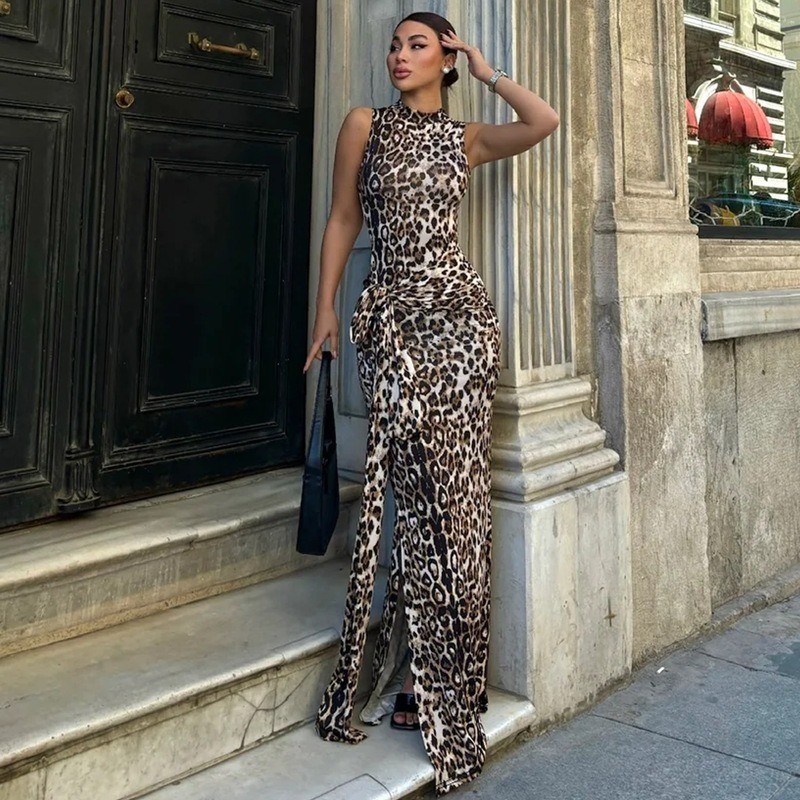 새로운 패션 커스텀 프린트 슬림 허리밴드 슬리트袖없는 드레스